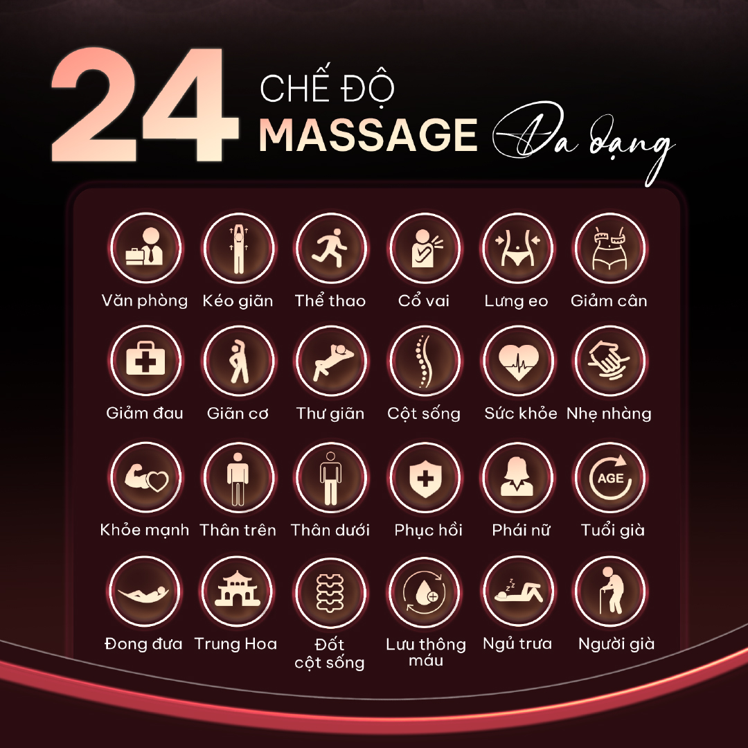 24 (Cổ vai, Lưng eo, Kéo giãn, Ngủ ngon, Văn phòng, Giảm cân, Giảm đau, Giãn cơ, Thư giãn, Cột sống, Lưu thông máu, Nhẹ nhàng, Thân trên, Thân dưới, Khỏe mạnh, Phục hồi, Phái nữ, Tuổi già, Ngủ trưa, Massage kiểu Trung Hoa, Đong đưa, Chăm sóc sức khỏe, Chăm sóc đốt cột sống, Người già)