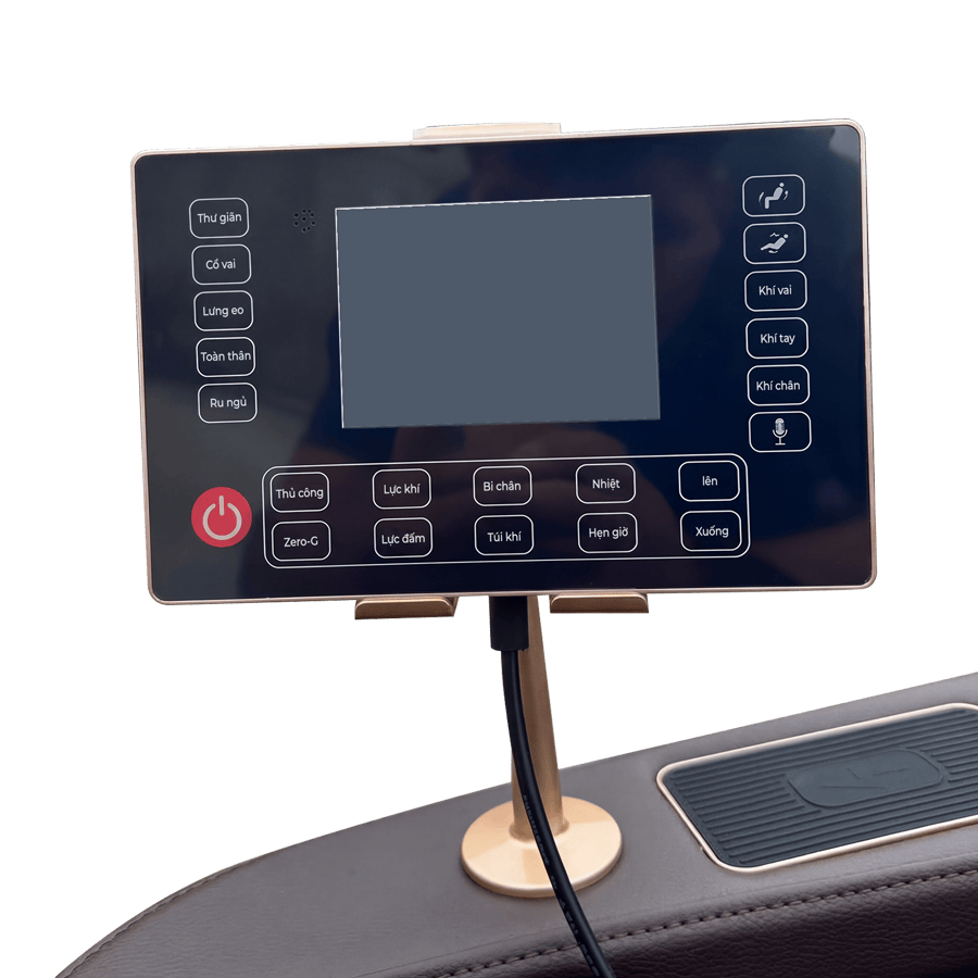 Màn hình điều khiển cảm ứng hiện đại giúp việc sử dụng trở nên dễ dàng ngay từ lần đầu. Các chế độ được hiển thị rõ ràng, cho phép tùy chỉnh nhanh chóng theo nhu cầu. Ghế còn tích hợp phím điều khiển nhanh, sạc USB và sạc không dây ngay tại tay vịn, mang đến sự tiện nghi tối đa trong quá trình sử dụng.