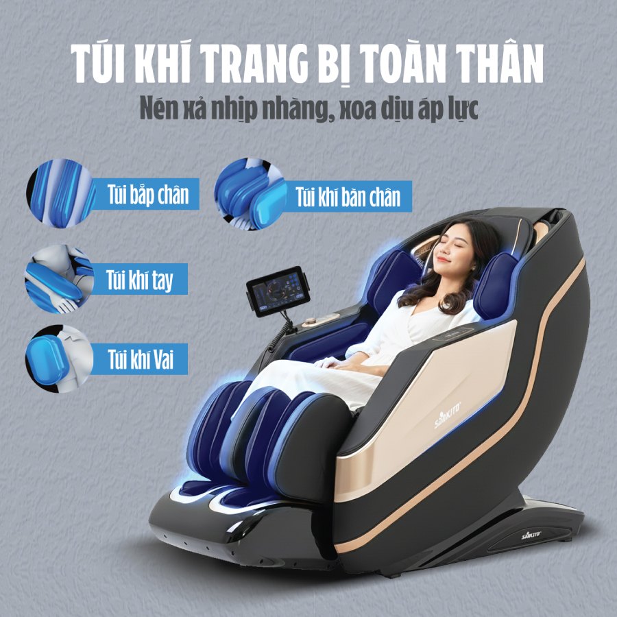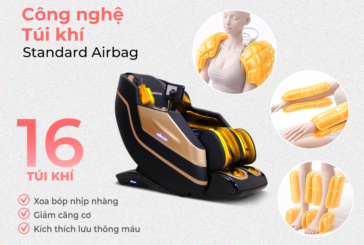 Với hệ thống túi khí xoa bóp được bố trí khắp cơ thể, mang lại cảm giác thư giãn và giảm căng thẳng cho các vùng cơ thể như vai, tay, chân và bụng. Túi khí không chỉ có tác dụng xoa bóp mà còn giúp cải thiện tuần hoàn máu, làm mềm các cơ bắp cứng nhắc.