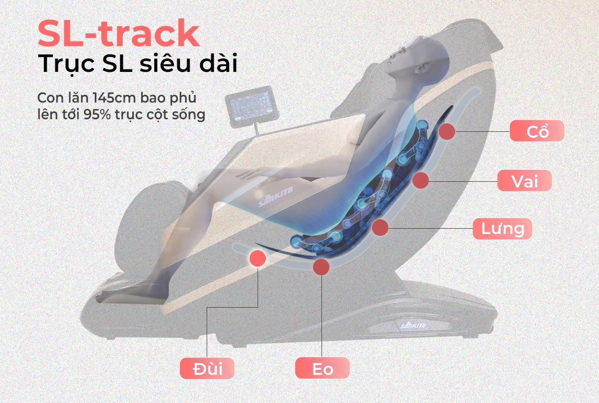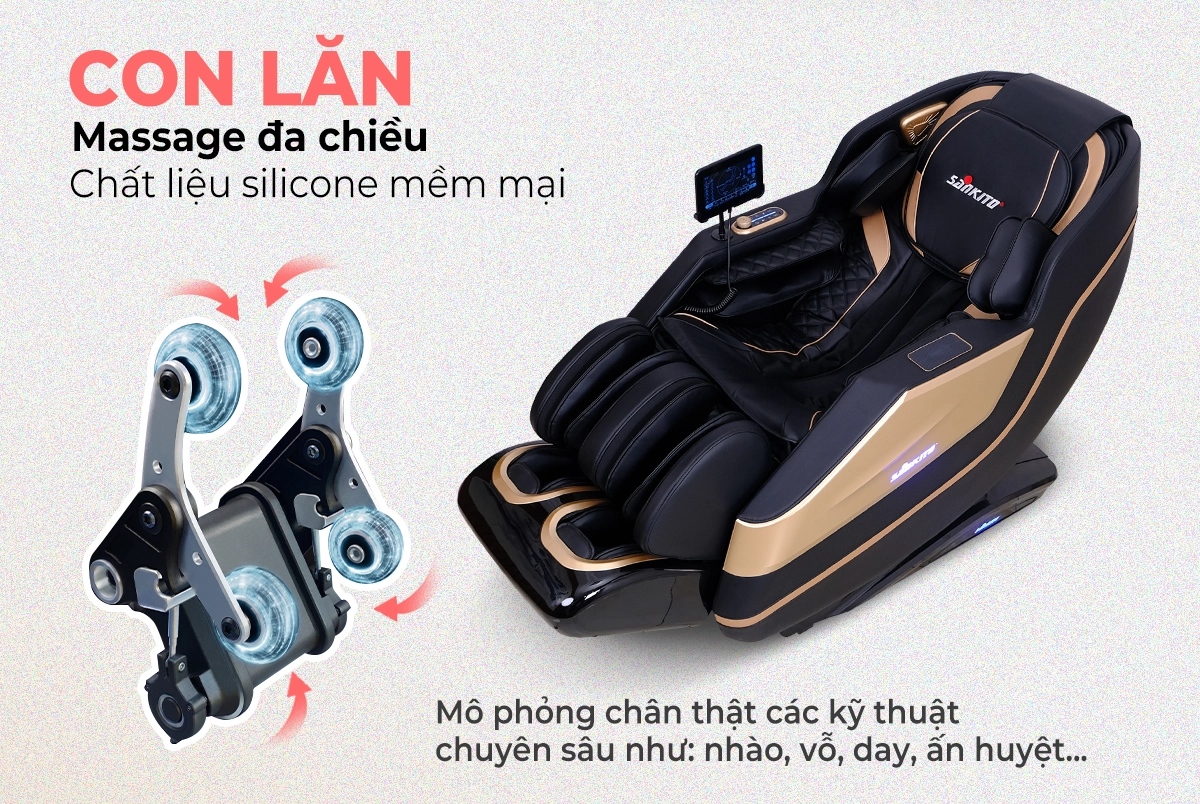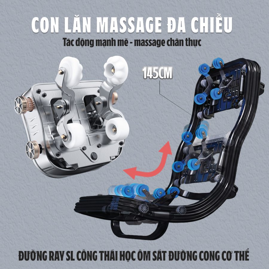 Sản phẩm trang bị con lăn đa kết hợp với đường ray SL, mang đến khả năng massage linh hoạt và hiệu quả. Con lăn di chuyển lên xuống, qua lại và có thể điều chỉnh độ sâu, giúp massage từ cổ, vai, lưng cho đến mông và chân một cách toàn diện.