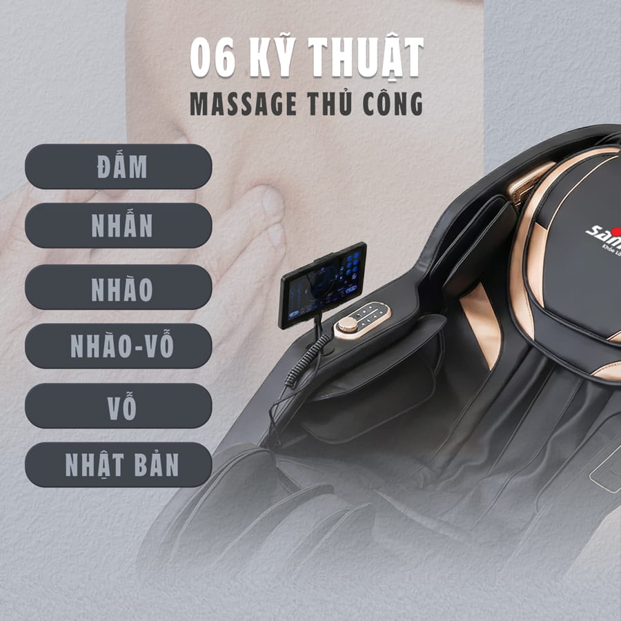 Không chỉ có những bài massage tự động, ghế còn tích hợp 6 kỹ thuật massage đặc biệt, từ Nhật Bản, nhào, đấm, vỗ, shiatsu, nhào vỗ. Những kỹ thuật này giúp kích thích tuần hoàn máu, giảm đau nhức cơ bắp, đồng thời mang lại cảm giác thư giãn sâu hơn.