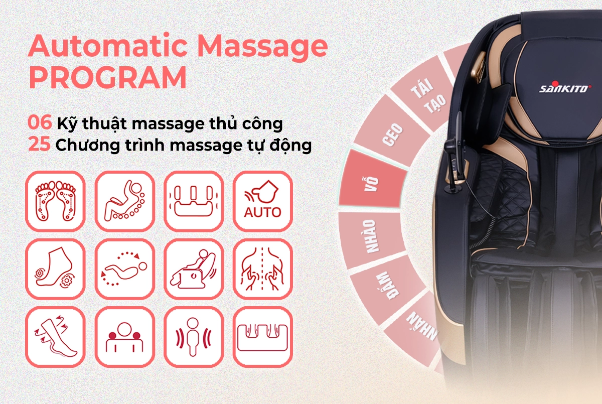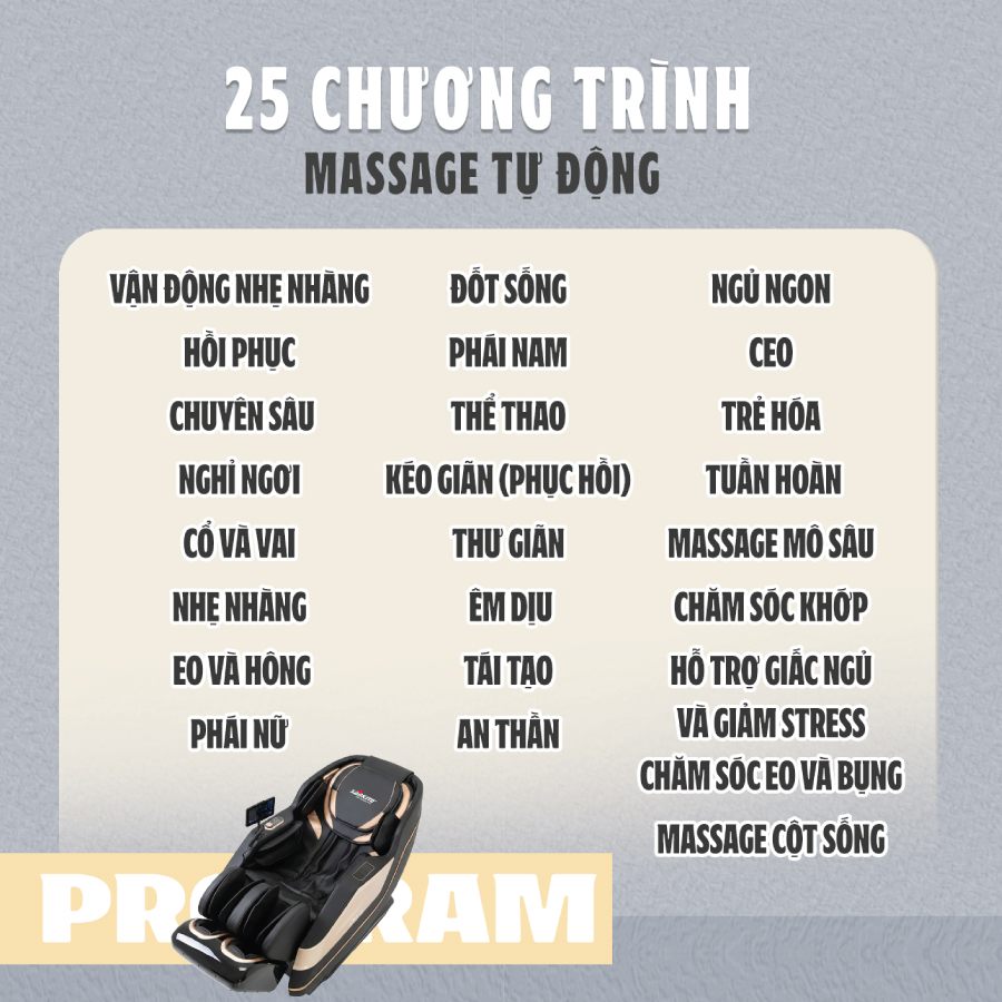 Với 25 chương trình massage tự động, sản phẩm mang lại đa dạng lựa chọn để phù hợp với nhu cầu thư giãn của từng người. Bạn chỉ cần chọn chương trình yêu thích, ghế sẽ tự động thực hiện các động tác massage từ nhẹ nhàng đến mạnh mẽ, giúp giảm căng thẳng, mệt mỏi hiệu quả.