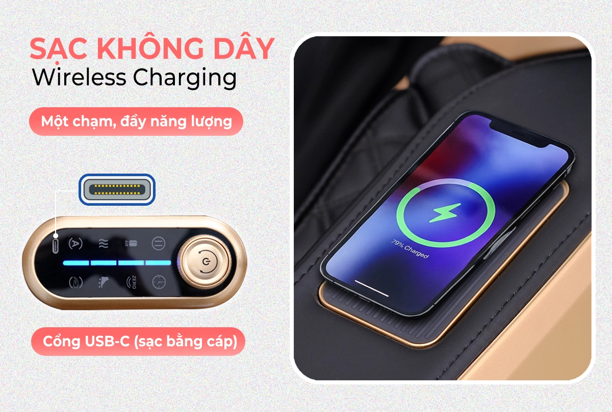Một tính năng cực kỳ tiện lợi chính là khả năng sạc không dây, giúp bạn có thể sạc đầy pin cho điện thoại khi đang nằm trên ghế.